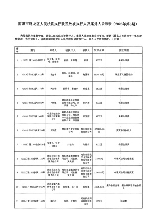 南阳市卧龙区人民法院执行款发放被执行人及案外人公示表(20026年第5期)