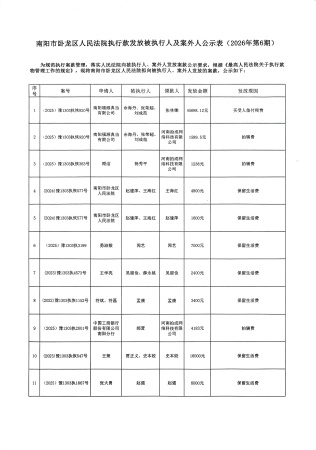 南阳市卧龙区人民法院执行款发放被执行人及案外人公示表(20026年第6期)