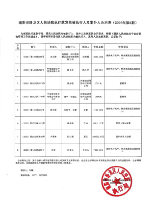 南阳市卧龙区人民法院执行款发放被执行人及案外人公示表(20026年第8期)
