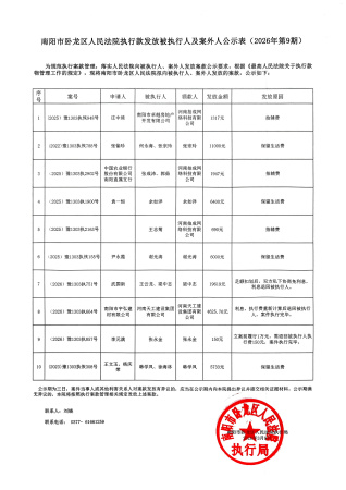 南阳市卧龙区人民法院执行款发放被执行人及案外人公示表(20026年第9期)