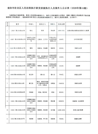 南阳市卧龙区人民法院执行款发放被执行人及案外人公示表(20026年第15期)